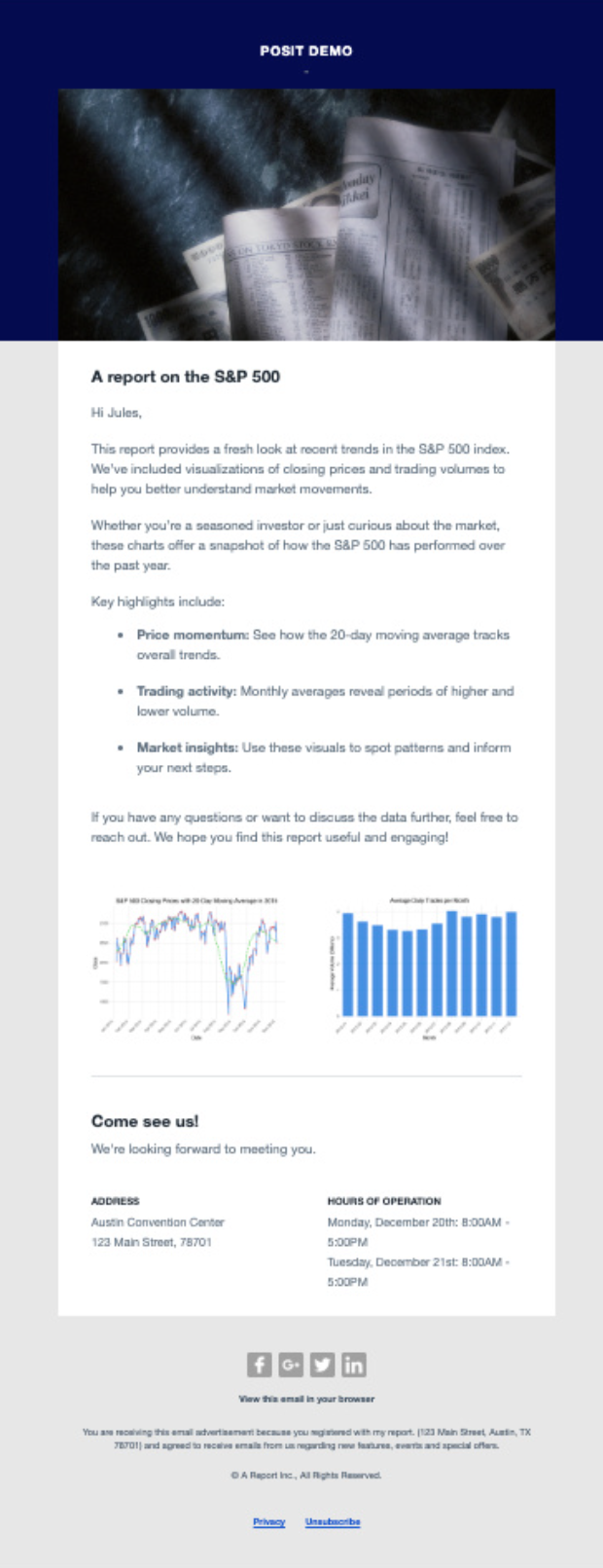 We’ll also quickly review writing more advanced content layouts, and authoring email reports that involve running code with Quarto.