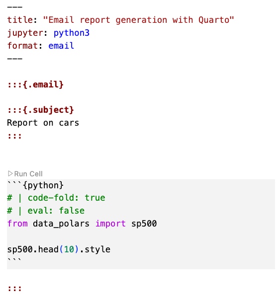import osfrom dotenv import load_dotenvfrom data_polars import sp500import redmailload_dotenv()gmail_address = os.environ["GMAIL_ADDRESS"]gmail_app_password = os.environ["GMAIL_APP_PASSWORD"]email_subject ="Report on Cars"email_body = sp500.head(10).style.as_raw_html(inline_css=True)# This is here to emphasize the sender does not have to be the same as the receiveremail_receiver = gmail_addressredmail.gmail.username = gmail_addressredmail.gmail.password = gmail_app_passwordredmail.gmail.send( subject=email_subject, receivers=[email_receiver], html=email_body,)