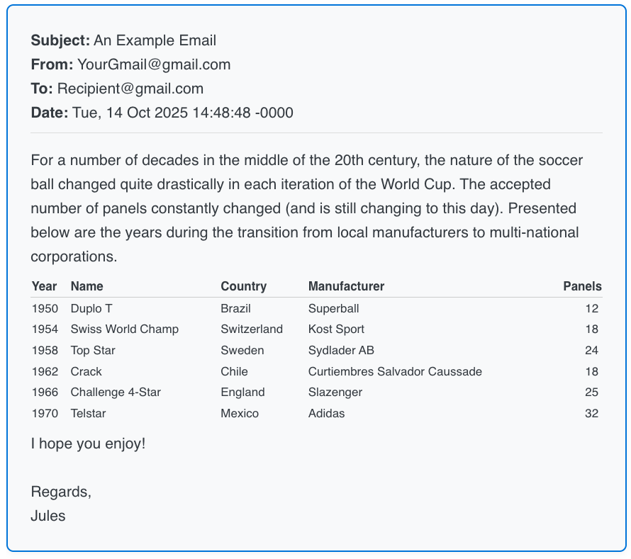 This is just one of many options: it is also possible to send emails in Python from other email providers (Outlook, ProtonMail, etc.), or even from a custom domain. To skip ahead to a discussion of alternative sending methods, see Authentication