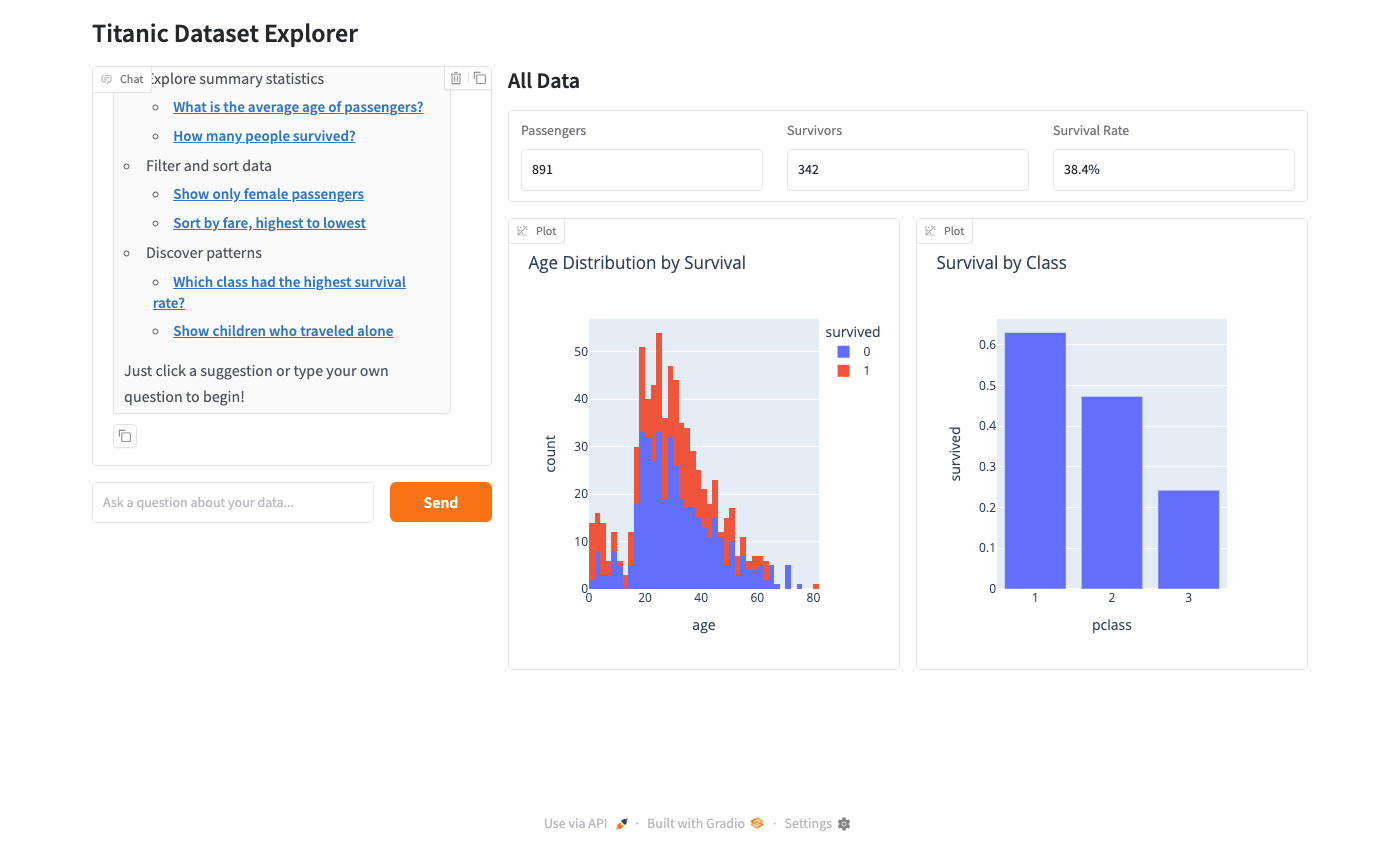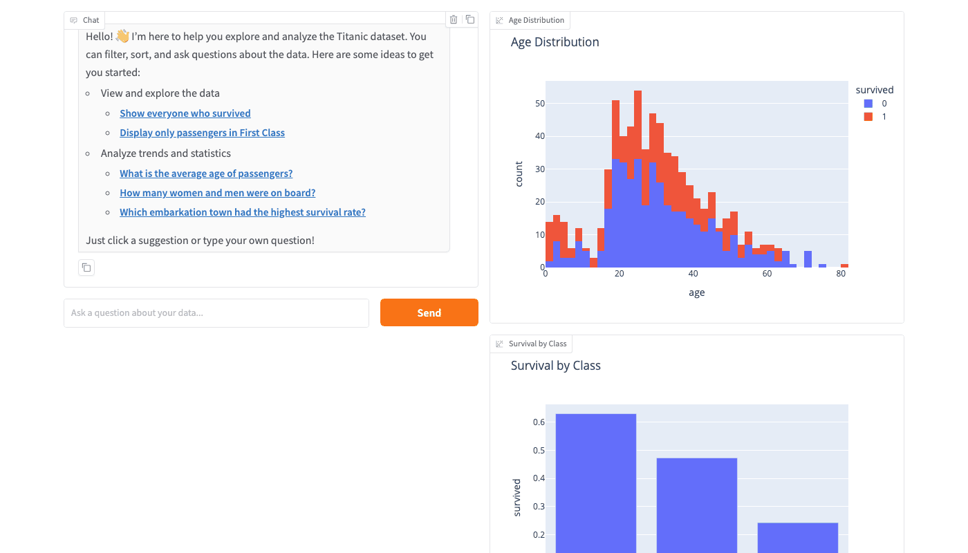 When users filter data through the chat (e.g., “show only survivors”), both charts update automatically.