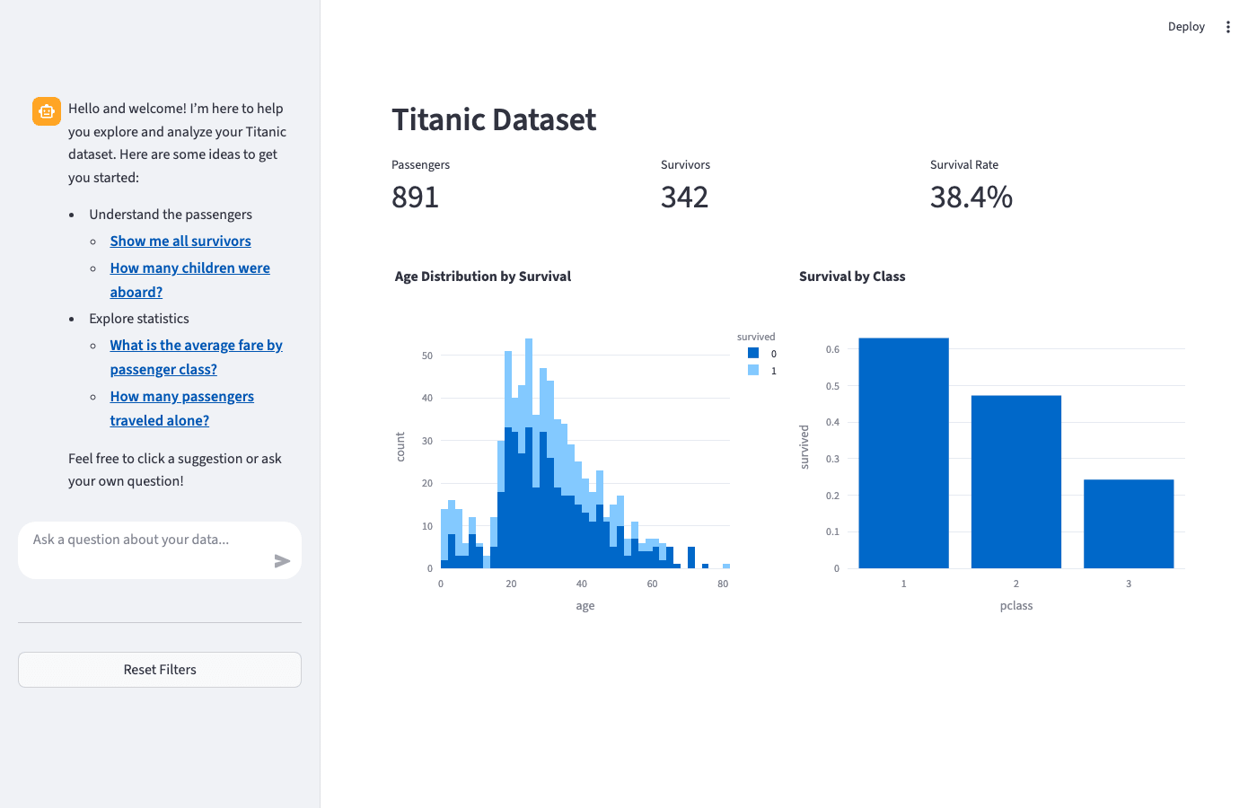 When users filter data through the chat (e.g., “show only survivors”), both views update automatically.