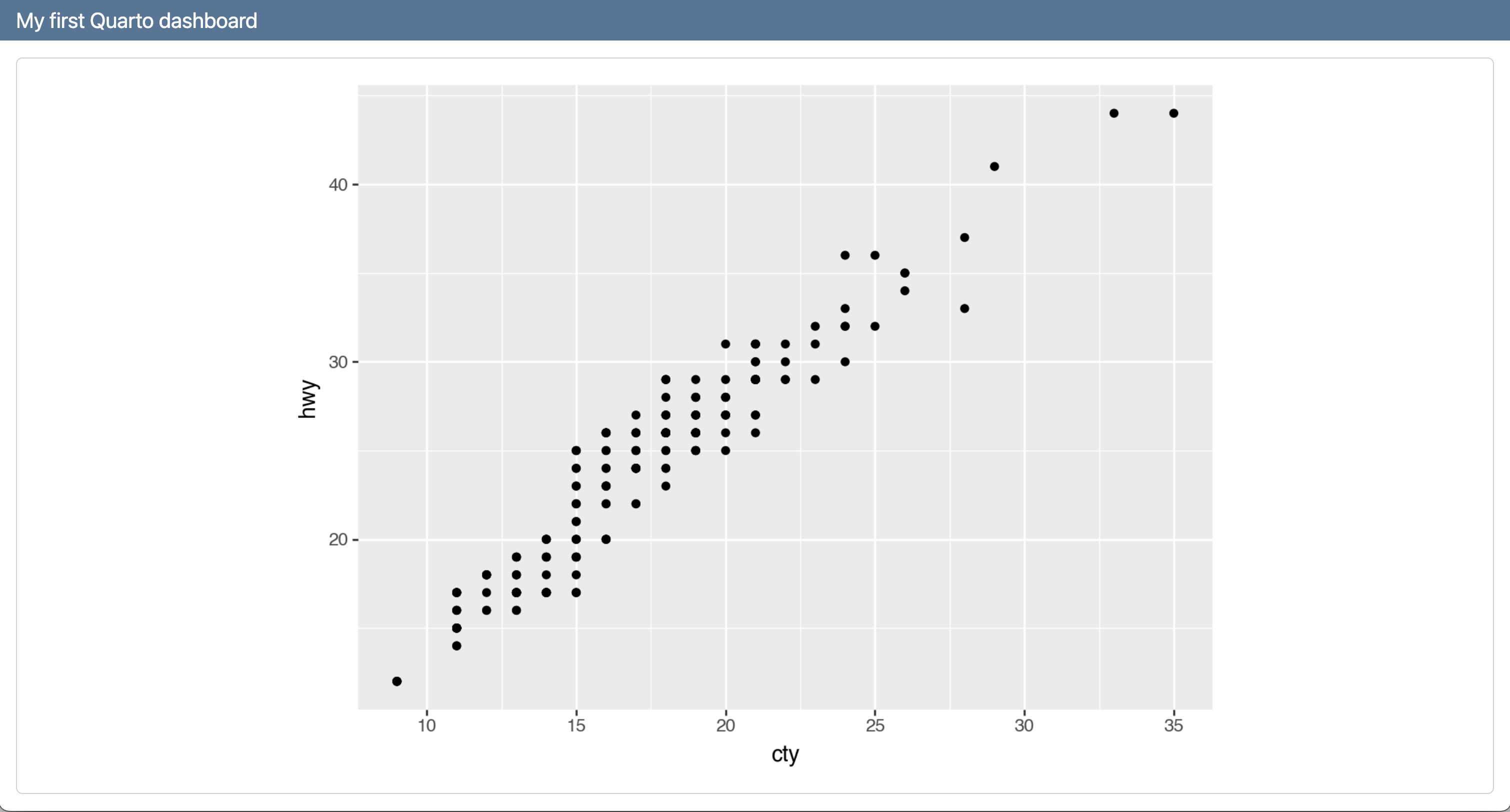 ggplot(mpg, aes(x = "cty", y = "hwy"))