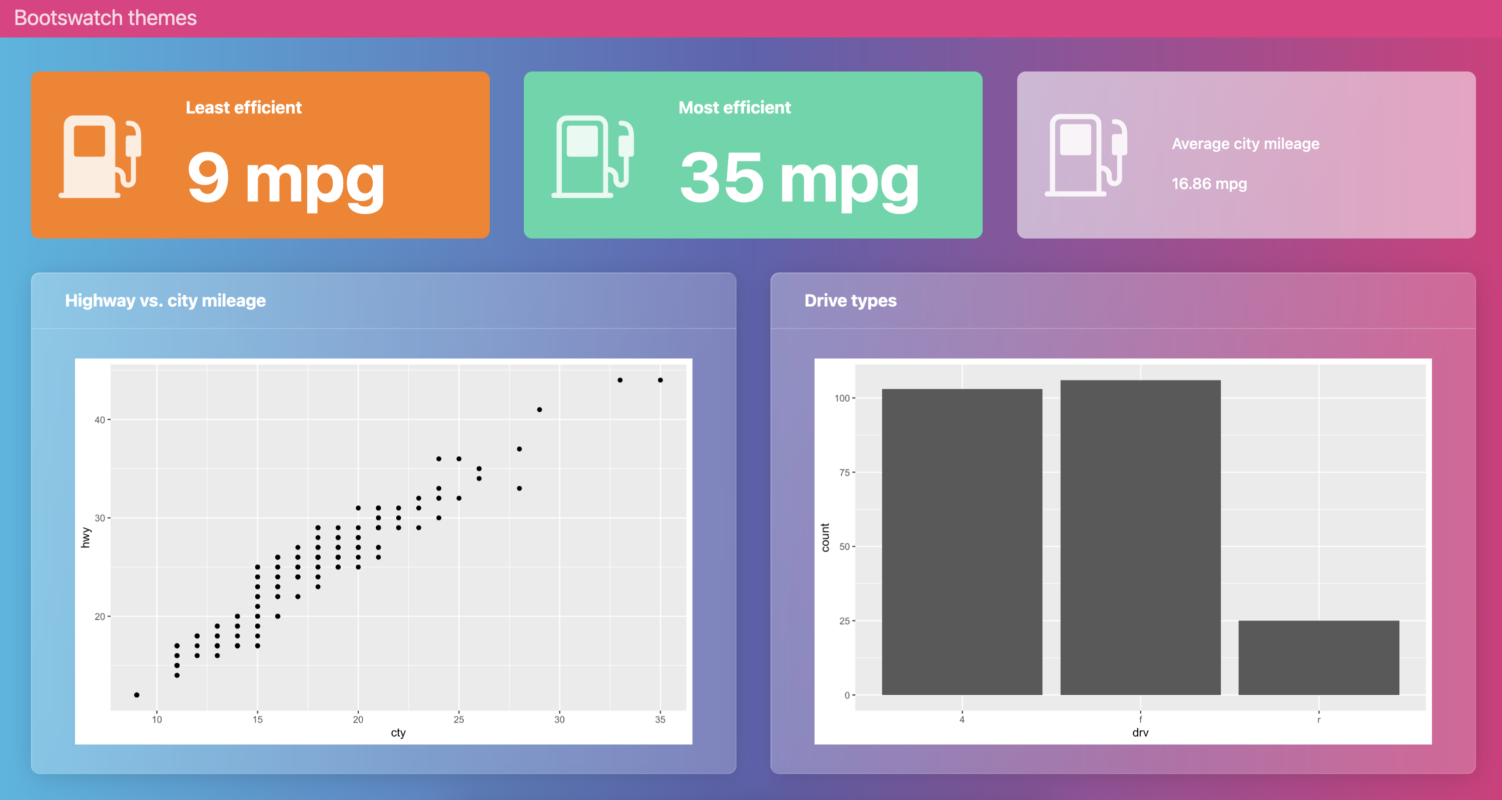plotnineplotlyQuarto dashboards can be styled with one of the 25 themes from the Bootswatch project: