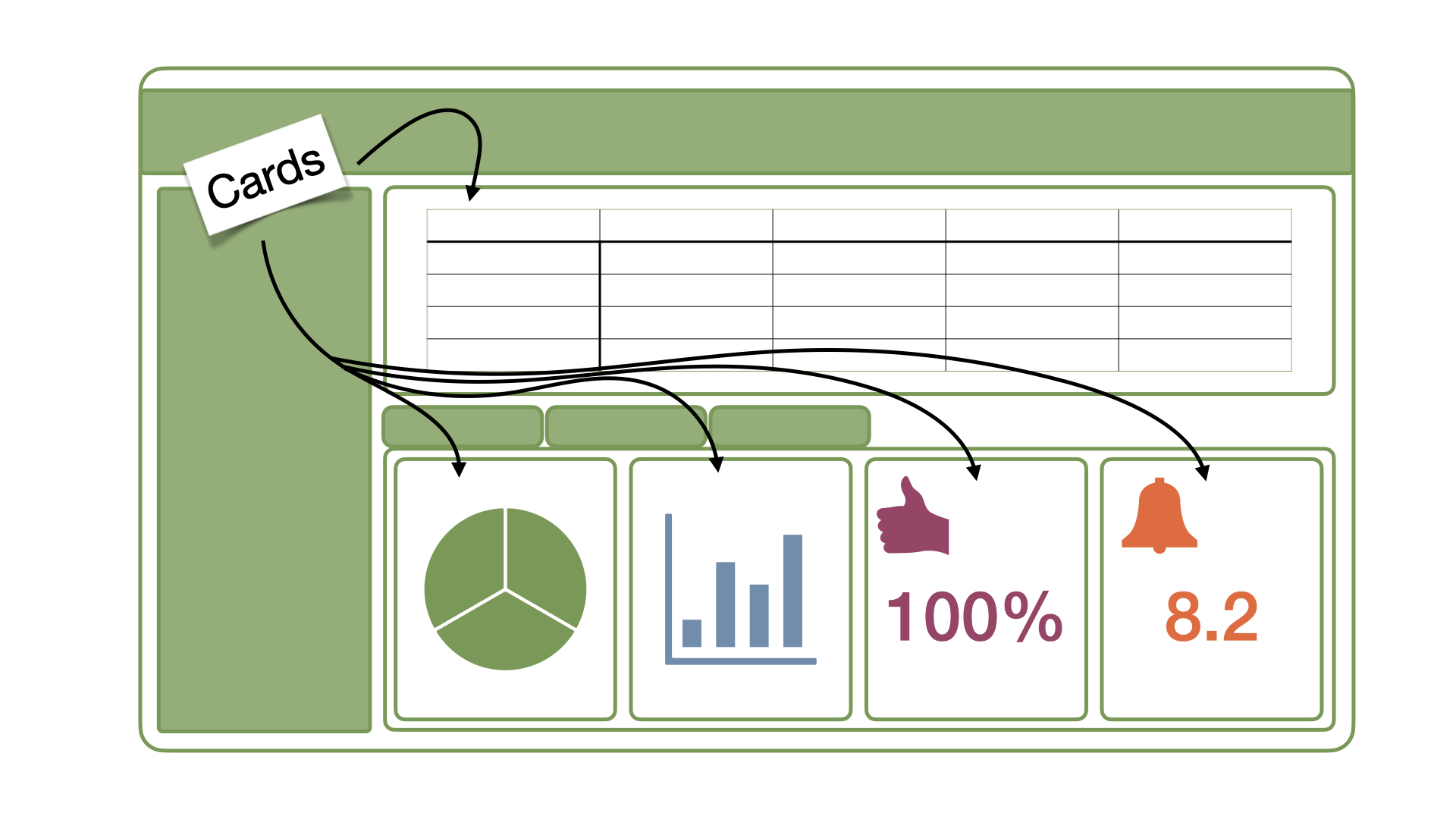 Cards are containers for code cell outputs (e.g., plots, tables, value boxes) and free form markdown text. The content of cards typically maps to cells in your notebook or source document.