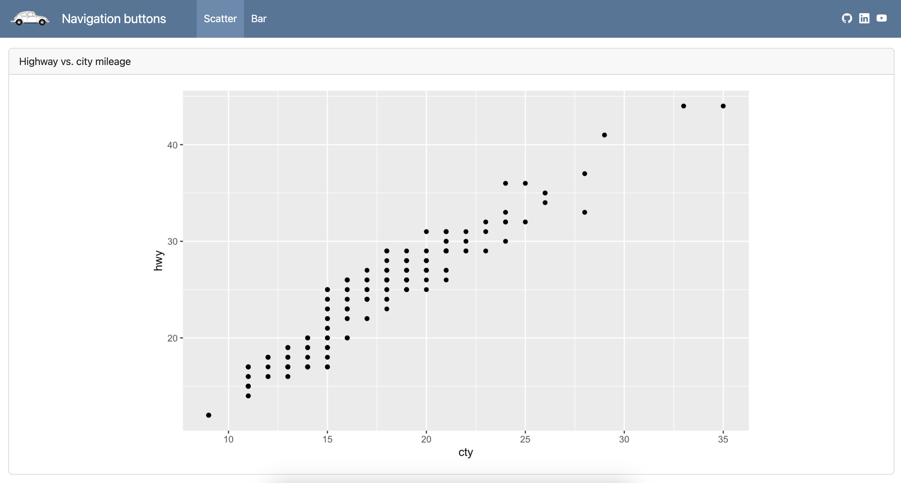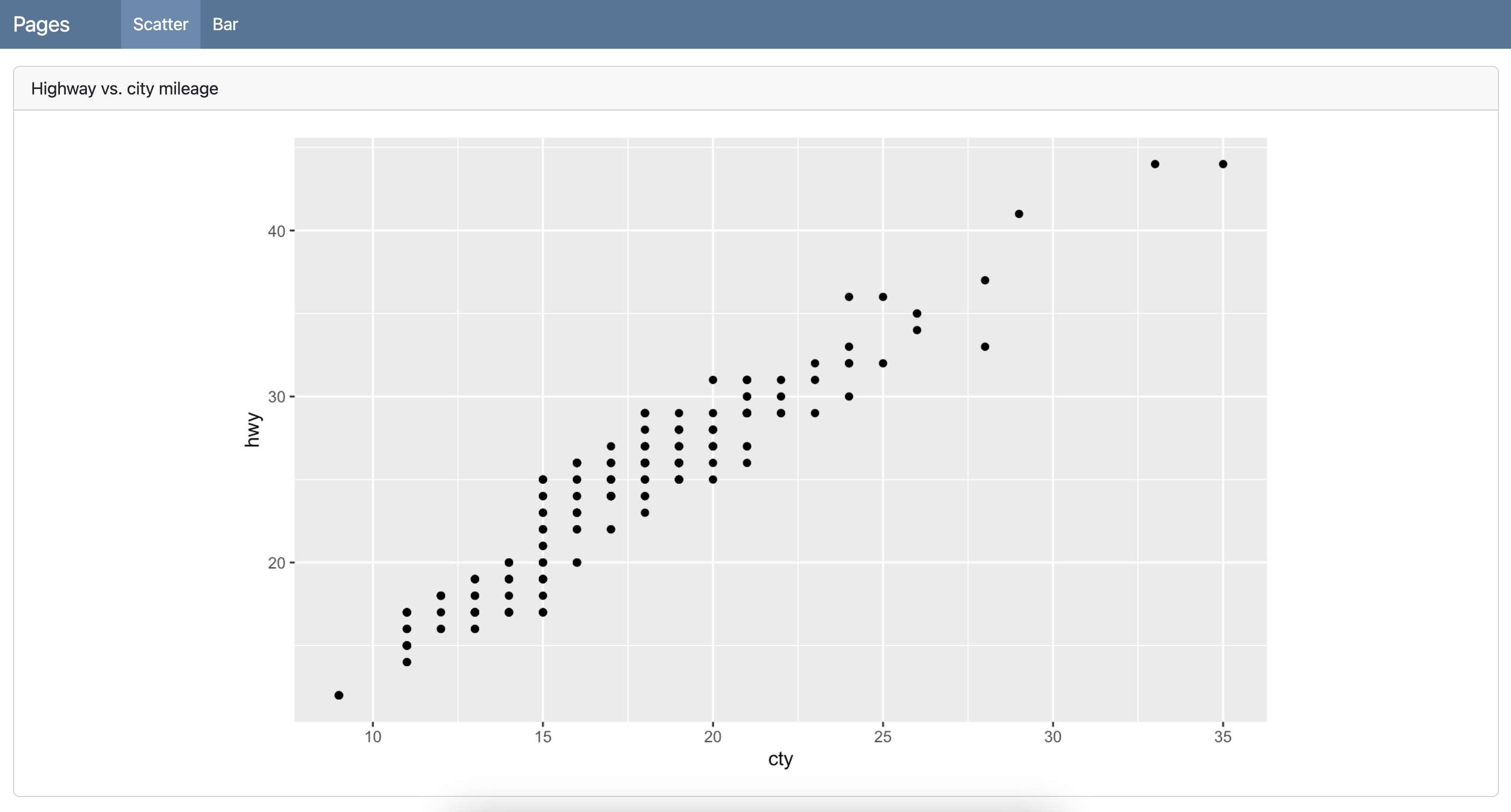 ggplot(mpg, aes(x = "cty", y = "hwy"))