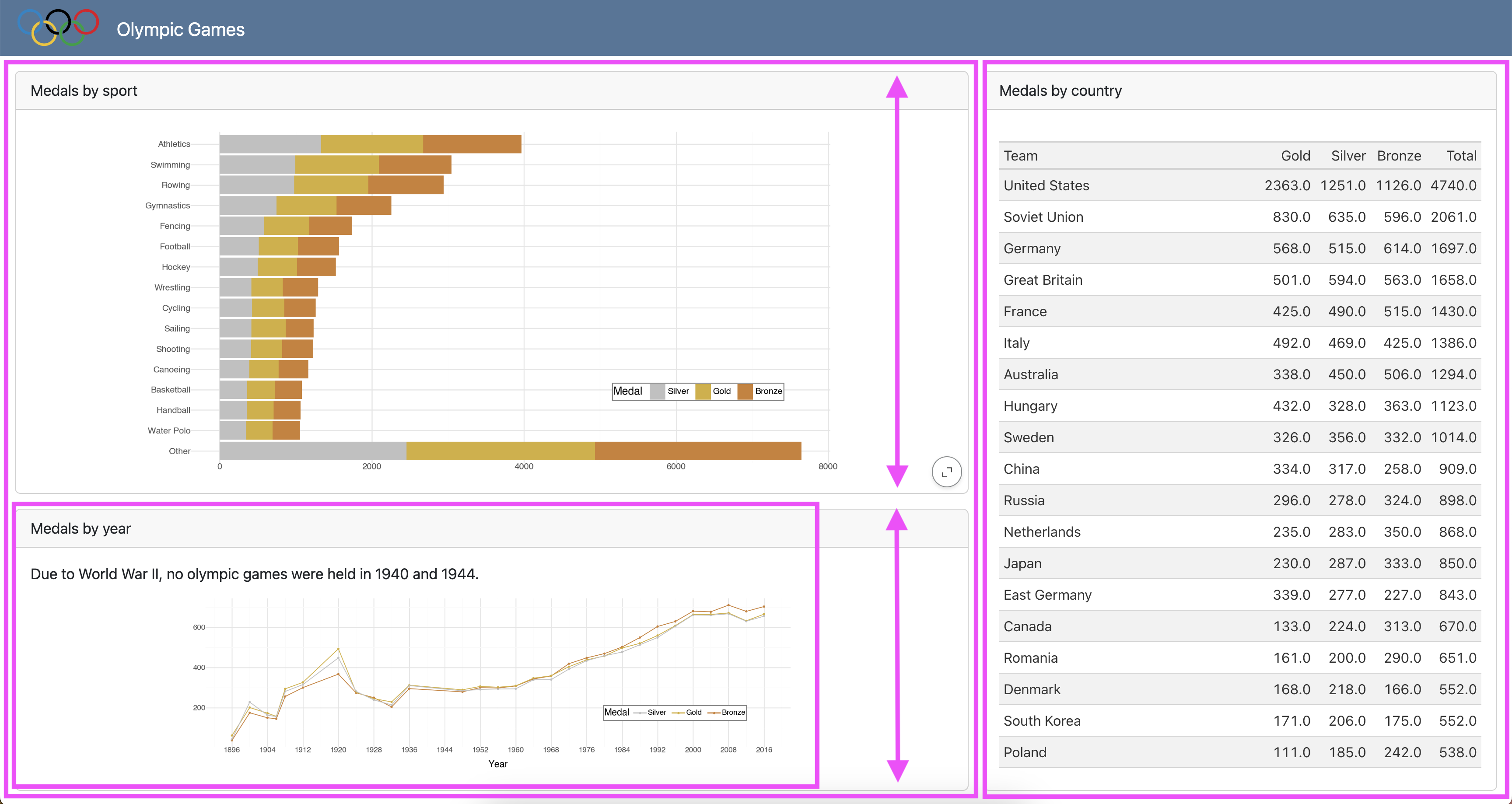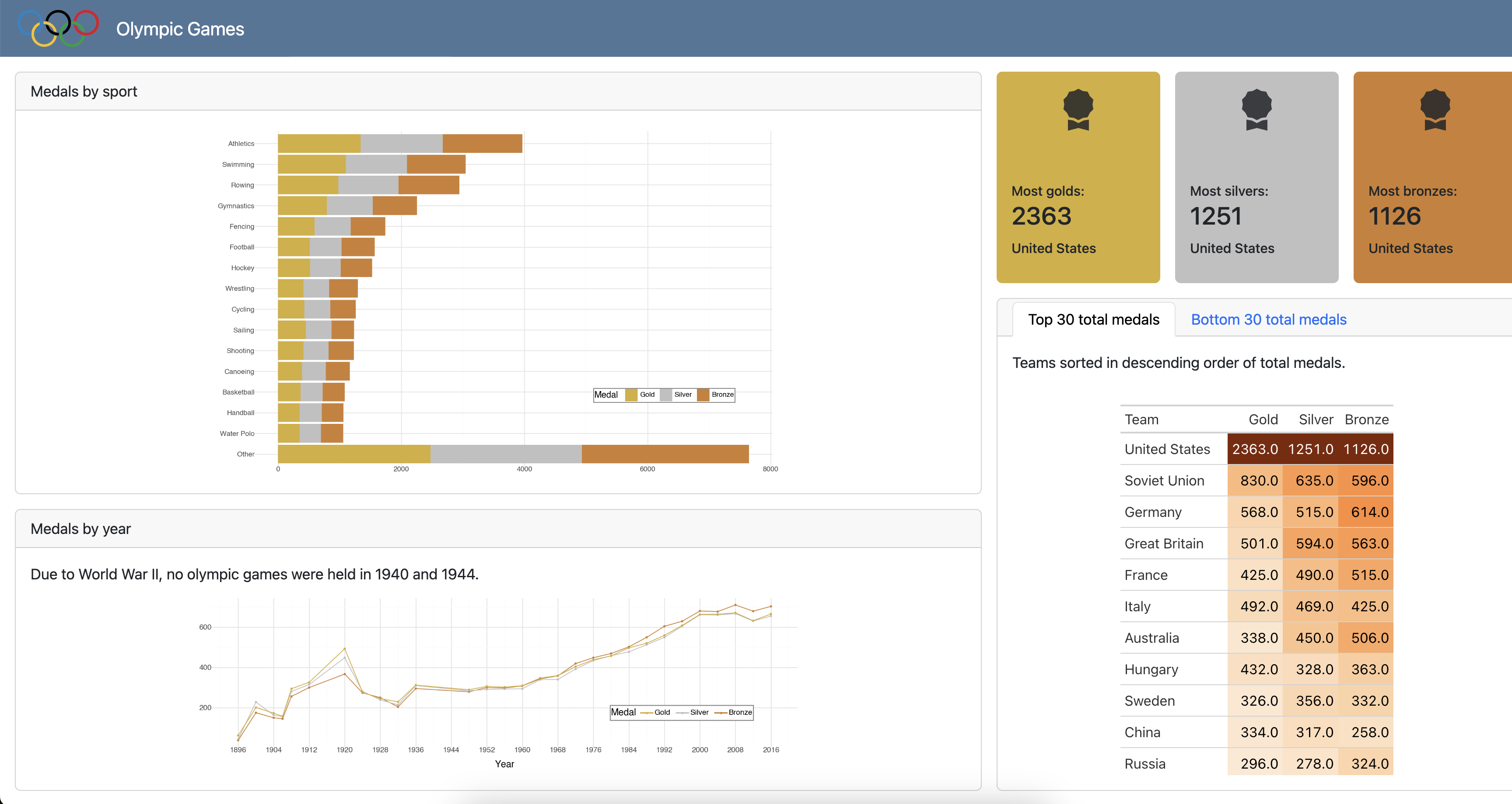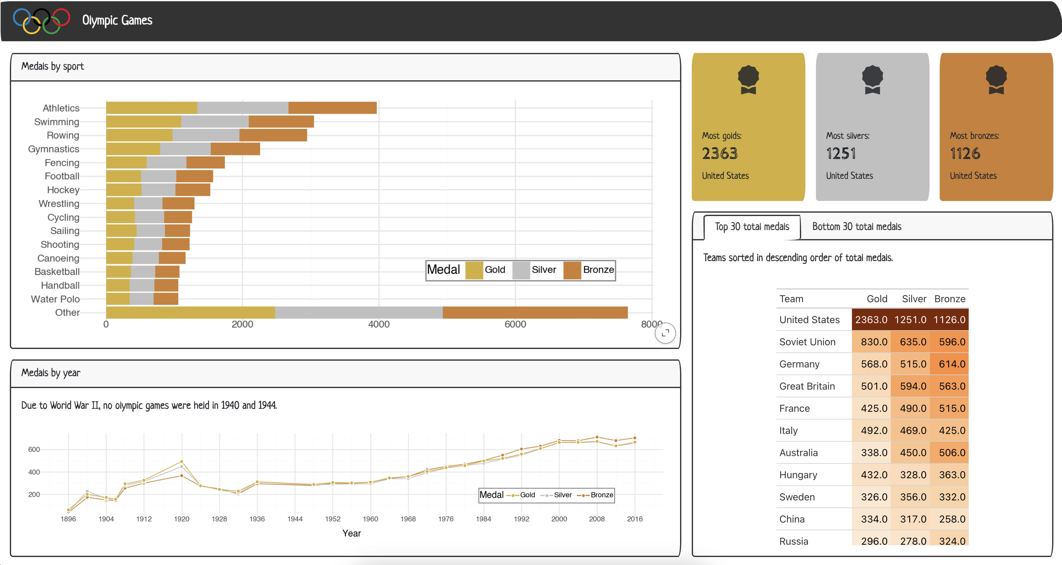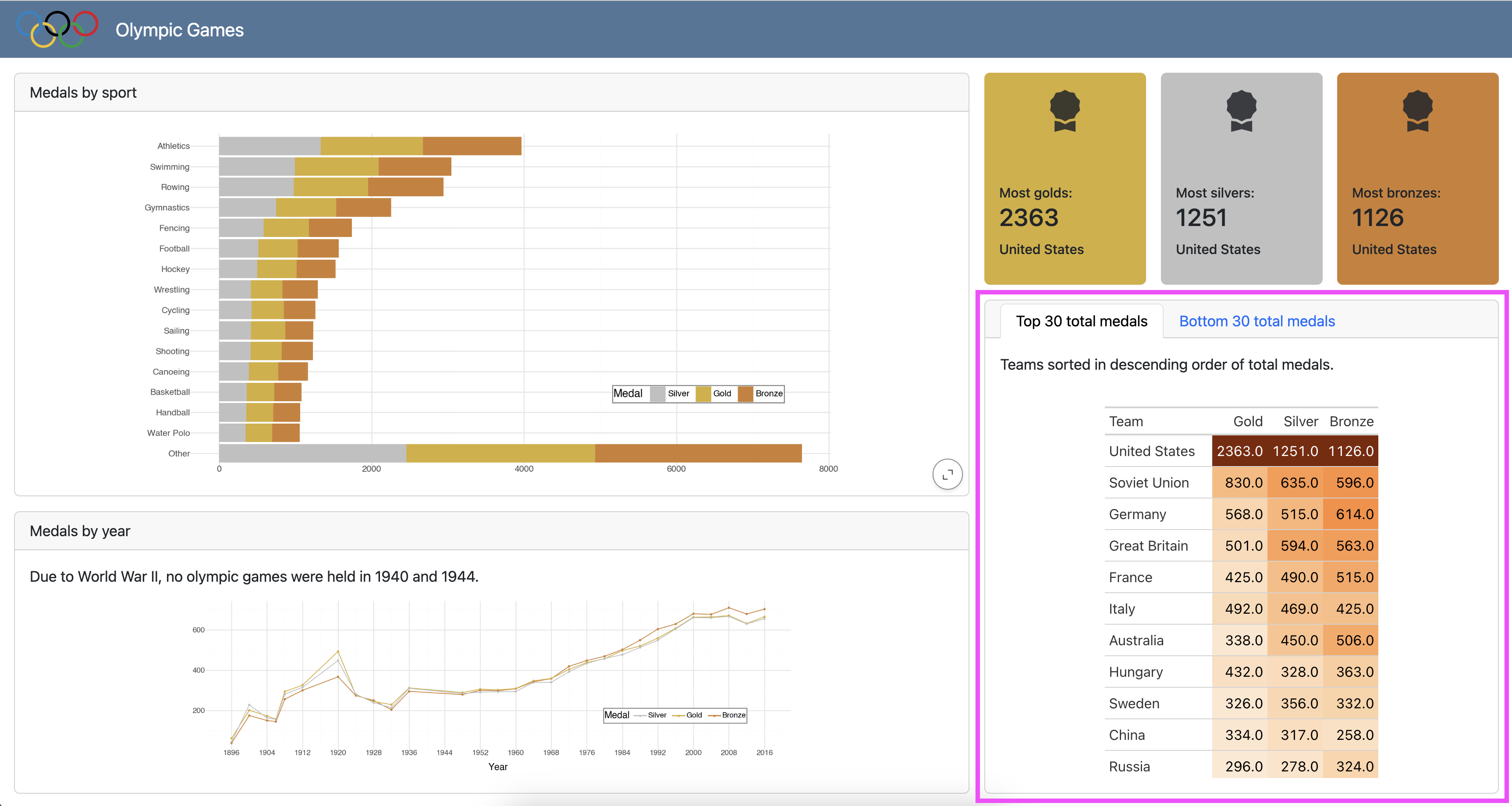 data_color().Un-comment the code under TODO for Step 3 and move it to the appropriate location. Use olympics_sorted_descending_top30 and olympics_sorted_ascending_bottom30 to create the tables.