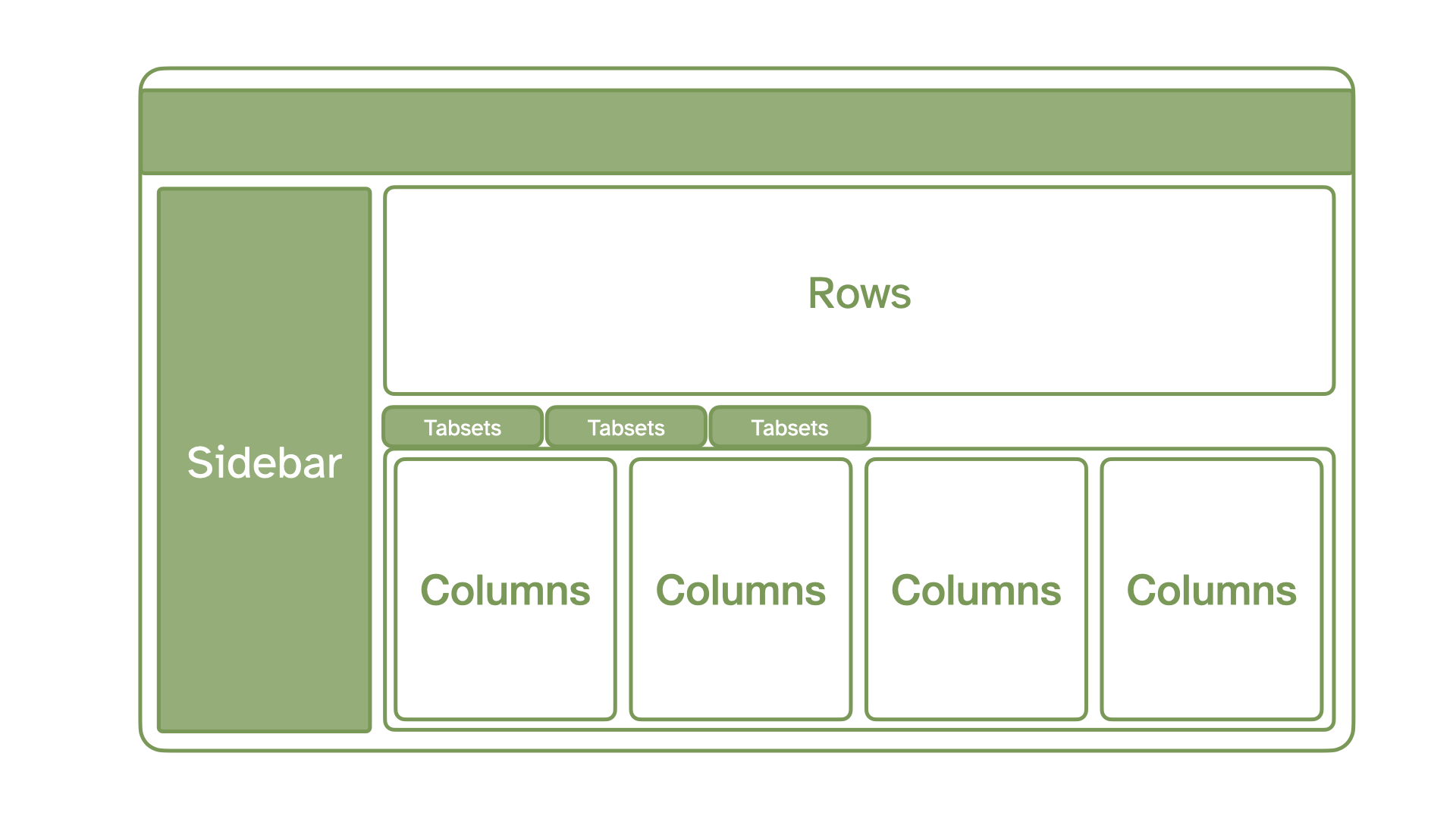 Rows and columns using markdown headings, with optional attributes to control height, width, etc. Sidebars, mostly used for for interactive inputs. Tabsets to further divide content.